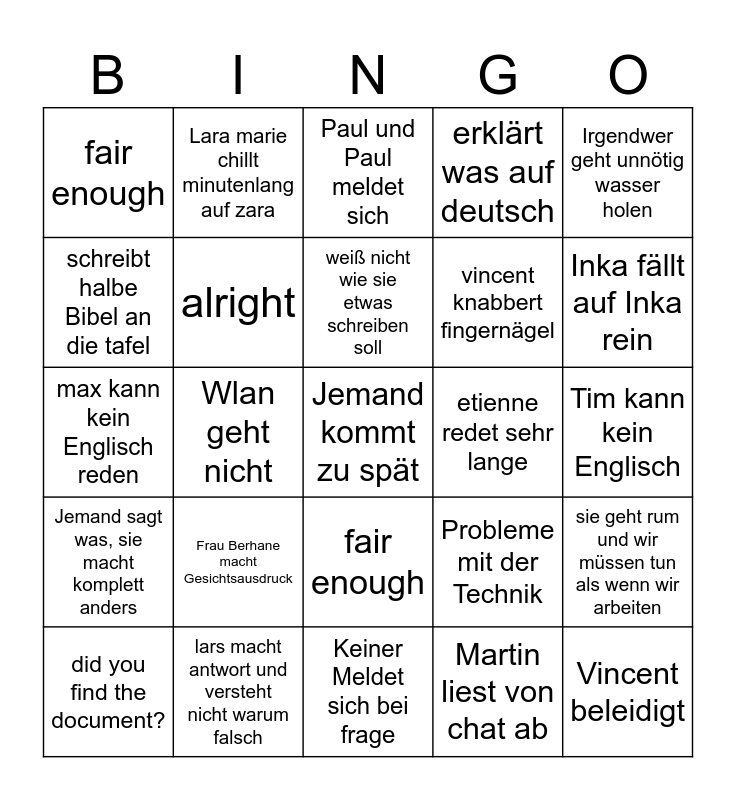 This bingo card has 25 words: Frau Berhane macht Gesichtsausdruck, Keiner Meldet sich bei frage, weiß nicht wie sie etwas schreiben soll, did you find the document?, Irgendwer geht unnötig wasser holen, fair enough, schreibt halbe Bibel an die tafel, Lara marie chillt minutenlang auf zara, etienne redet sehr lange, fair enough, vincent knabbert fingernägel, max kann kein Englisch reden, Probleme mit der Technik, sie geht rum und wir müssen tun als wenn wir arbeiten, alright, Vincent beleidigt, Tim kann kein Englisch, Paul und Paul meldet sich, Inka fällt auf Inka rein, Wlan geht nicht, Jemand kommt zu spät, lars macht antwort und versteht nicht warum falsch, Jemand sagt was, sie macht komplett anders, erklärt was auf deutsch and Martin liest von chat ab.