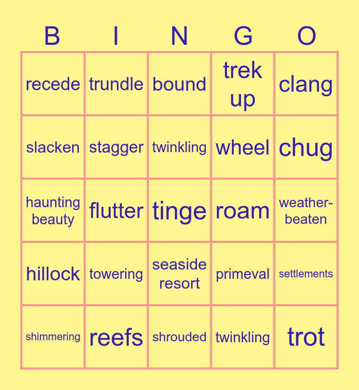 This bingo card has 25 words: towering, shrouded, twinkling, shimmering, clang, recede, slacken, trundle, roam, seaside resort, wheel, haunting beauty, primeval, settlements, stagger, trot, weather- beaten, bound, chug, flutter, tinge, reefs, hillock, trek up and twinkling.