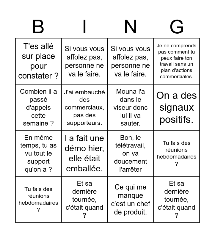 This bingo card has 16 words: Et sa dernière tournée, c'était quand ?, Tu fais des réunions hebdomadaires ?, Si vous vous affolez pas, personne ne va le faire., T'es allé sur place pour constater ?, En même temps, tu as vu tout le support qu'on a ?, Si vous vous affolez pas, personne ne va le faire., Bon, le télétravail, on va doucement l'arrêter, Ce qui me manque c'est un chef de produit., Combien il a passé d'appels cette semaine ?, J'ai embauché des commerciaux, pas des supporteurs., Tu fais des réunions hebdomadaires ?, Je ne comprends pas comment tu peux faire ton travail sans un plan d'actions commerciales., l a fait une démo hier, elle était emballée., On a des signaux positifs., Mouna l'a dans le viseur donc lui il va sauter. and Et sa dernière tournée, c'était quand ?.