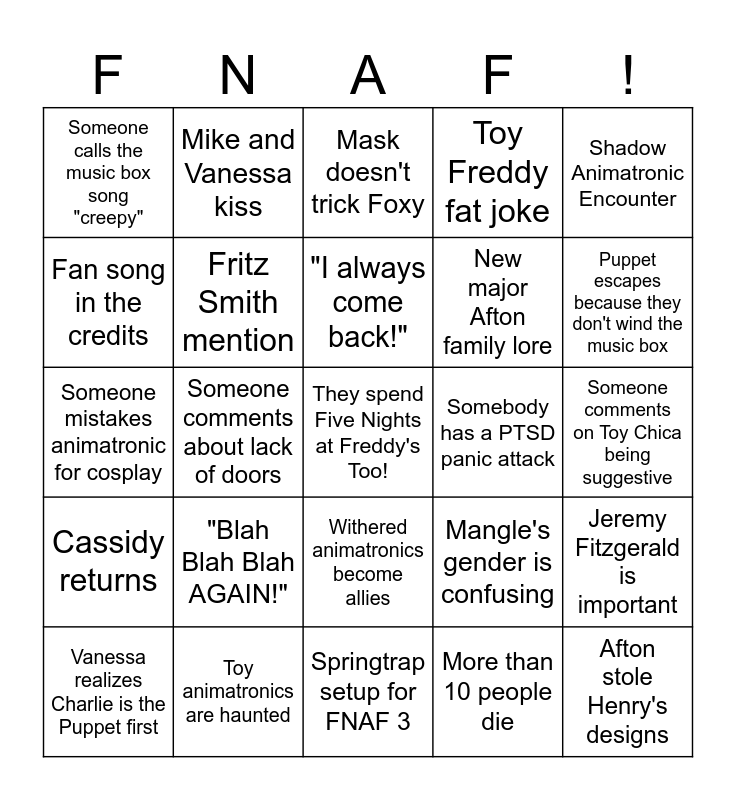 This bingo card has a free space and 24 words: "Blah Blah Blah AGAIN!", Toy animatronics are haunted, "I always come back!", Vanessa realizes Charlie is the Puppet first, Shadow Animatronic Encounter, Someone calls the music box song "creepy", Fan song in the credits, Mike and Vanessa kiss, Somebody has a PTSD panic attack, Withered animatronics become allies, New major Afton family lore, Someone mistakes animatronic for cosplay, Mangle's gender is confusing, Jeremy Fitzgerald is important, Fritz Smith mention, More than 10 people die, Someone comments on Toy Chica being suggestive, Mask doesn't trick Foxy, Puppet escapes because they don't wind the music box, Someone comments about lack of doors, Afton stole Henry's designs, Cassidy returns, Toy Freddy fat joke and Springtrap setup for FNAF 3.