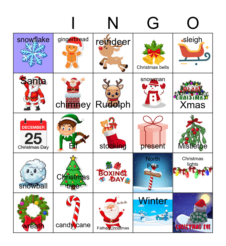 This bingo card has 24 images, a free space and 22 words: Christmas tree, candy cane, Rudolph, wreath, sleigh, snowflake, Santa, gingerbread, present, snowman, Christmas Day, North Pole, Christmas lights, chimney, Winter, Mistletoe, reindeer, Xmas, Elf, snowball, Christmas bells and Father Christmas.