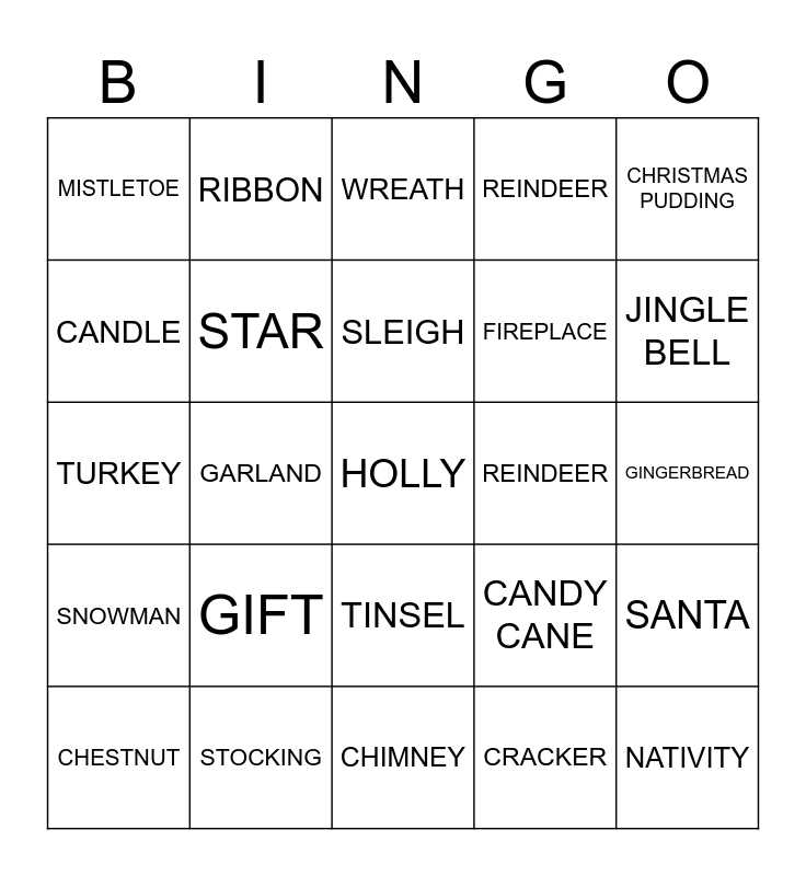 This bingo card has a free space and 28 words: SANTA, CAROL, FIREPLACE, CRACKER, CANDLE, WREATH, RIBBON, SNOWMAN, REINDEER, CHESTNUT, TURKEY, REINDEER, STOCKING, CHIMNEY, JINGLE BELL, CHRISTMAS TREE, GIFT, STAR, SLEIGH, TINSEL, MISTLETOE, BAUBLES, NATIVITY, GARLAND, GINGERBREAD, CANDY CANE, CHRISTMAS PUDDING and BELL.