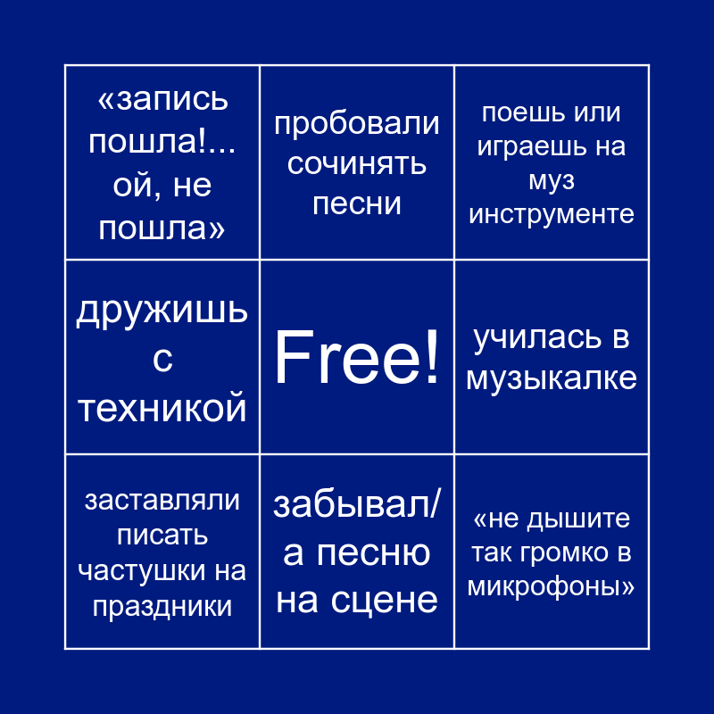 This bingo card has a free space and 8 words: училась в музыкалке, поешь или играешь на муз инструменте, пробовали сочинять песни, заставляли писать частушки на праздники, «запись пошла!... ой, не пошла», «не дышите так громко в микрофоны», дружишь с техникой and забывал/а песню на сцене.