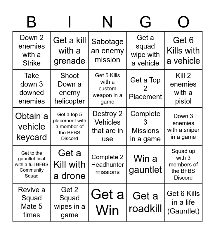 This bingo card has a free space and 24 words: Get a Kill with a drone, Get 2 Squad wipes in a game, Get 5 Kills with a custom weapon in a game, Revive a Squad Mate 5 times, Get 6 Kills with a vehicle, Down 2 enemies with a Strike, Take down 3 downed enemies, Get a kill with a grenade, Complete 3 Missions in a game, Complete 2 Headhunter missions, Get a Top 2 Placement, Obtain a vehicle keycard, Win a gauntlet, Squad up with 3 members of the BFBS Discord, Shoot Down a enemy helicopter, Get a roadkill, Down 3 enemies with a sniper in a game, Sabotage an enemy mission, Kill 2 enemies with a pistol, Get a top 5 placement with a member of the BFBS Discord, Get 6 Kills in a life (Gauntlet), Get to the gauntlet final with a full BFBS Community Squad, Get a squad wipe with a vehicle and Get a Win.