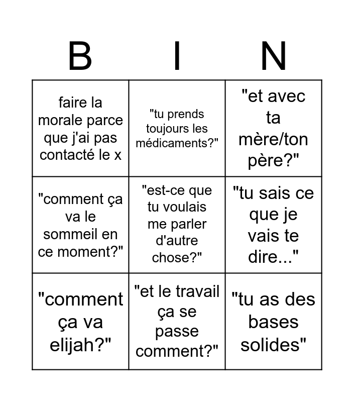 This bingo card has 9 words: "comment ça va elijah?", "et avec ta mère/ton père?", "tu prends toujours les médicaments?", "comment ça va le sommeil en ce moment?", faire la morale parce que j'ai pas contacté le x, "tu sais ce que je vais te dire...", "est-ce que tu voulais me parler d'autre chose?", "tu as des bases solides" and "et le travail ça se passe comment?".