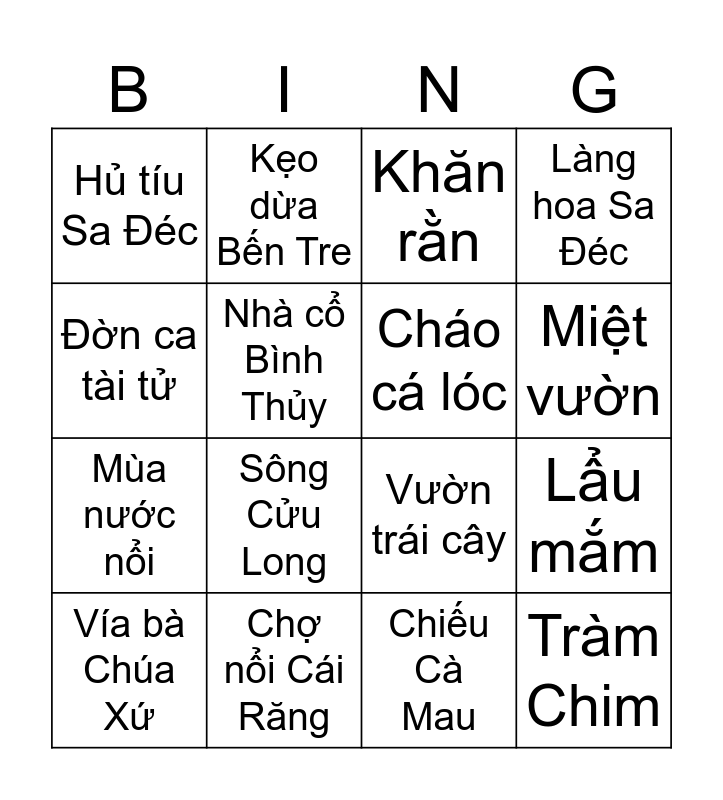 This bingo card has 20 words: Lẩu mắm, Bánh xèo miền Tây, Khăn rằn, Áo bà ba, Vía bà Chúa Xứ, Đờn ca tài tử, Chợ nổi Cái Răng, Hủ tíu Sa Đéc, Mùa nước nổi, Kẹo dừa Bến Tre, Sông Cửu Long, Vườn trái cây, Nhà cổ Bình Thủy, Tràm Chim, Cháo cá lóc, Rừng tràm Trà Sư, Miệt vườn, Làng hoa Sa Đéc, Chiếu Cà Mau and Lễ hội Óc-om-bóc.