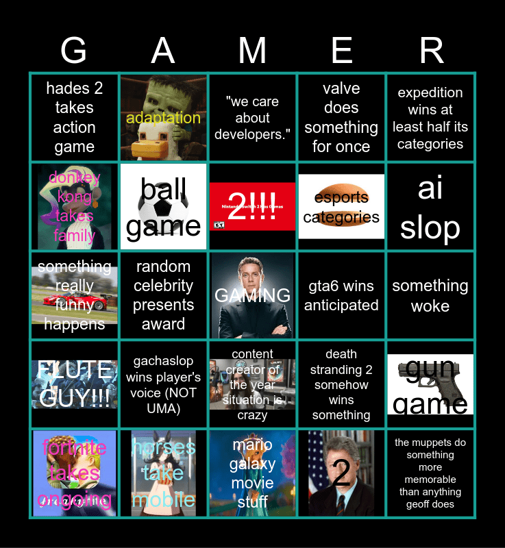 This bingo card has 13 images, a free space and 24 words: gachaslop wins player's voice (NOT UMA), horses take mobile, 2!!!, fortnite takes ongoing, expedition wins at least half its categories, hades 2 takes action game, donkey kong takes family, adaptation, gta6 wins anticipated, content creator of the year situation is crazy, esports categories, something really funny happens, death stranding 2 somehow wins something, gun game, ball game, 2, something woke, "we care about developers.", ai slop, random celebrity presents award, the muppets do something more memorable than anything geoff does, FLUTE GUY!!!, valve does something for once and mario galaxy movie stuff.
