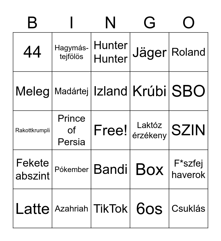 This bingo card has a free space and 29 words: Latte, Berserk, Prince of Persia, Dock, 44, Hunter Hunter, Madártej, Pókember, Laktóz érzékeny, Azahriah, SZIN, Csuklás, TikTok, 6os, SBO, Red Dead Redemption 2, Bandi, Fekete abszint, Roland, Rakottkrumpli, Box, Rózsa, Krúbi, Meleg, Jäger, Hagymás-tejfölös, F*szfej haverok, Izland and Beton Hofi.
