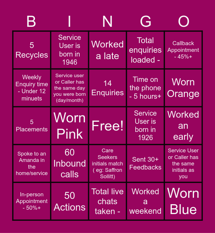 This bingo card has a free space and 24 words: 60 Inbound calls, 50 Actions, 14 Enquiries, In-person Appointment - 50%+, Callback Appointment - 45%+, 5 Recycles, Weekly Enquiry time - Under 12 minuets, Service User is born in 1946, Service User is born in 1926, Care Seekers initials match ( eg: Saffron Sollitt), Time on the phone - 5 hours+, 5 Placements, Sent 30+ Feedbacks, Service User or Caller has the same initials as you, Service user or Caller has the same day you were born (day/month), Worked a weekend, Worked an early, Worked a late, Worn Orange, Worn Pink, Worn Blue, Spoke to an Amanda in the home/service, Total enquiries loaded - and Total live chats taken -.