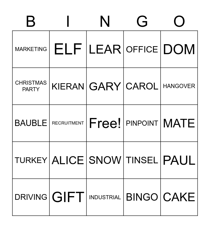 This bingo card has a free space and 37 words: TAYLOR, COLIN, CLARE, KIERAN, PAUL, ALICE, GARY, JOHN, DOM, FAYE, RECRUITMENT, OFFICE, CAKE, MATE, CHRISTMAS PARTY, TURKEY, UNIPRES, LEAR, SNOW, PINPOINT, MARKETING, HANGOVER, DRIVING, INDUSTRIAL, ENGINEER, BINGO, ELF, SANTA, BELLS, REINDEER, HOLLY, GIFT, BAUBLE, SPROUTS, TINSEL, CAROL and QUIZ.