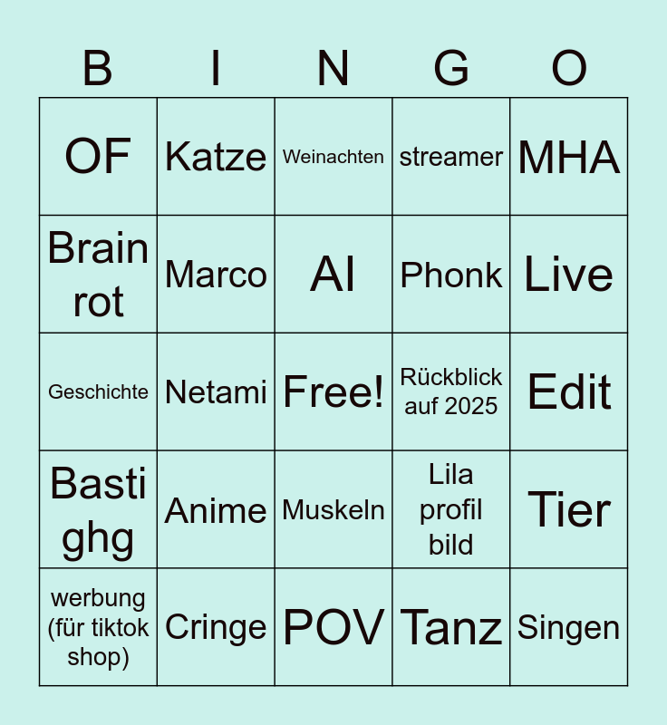 This bingo card has a free space and 24 words: Anime, Cringe, AI, werbung (für tiktok shop), MHA, OF, Brain rot, Katze, Rückblick auf 2025, Muskeln, Phonk, Geschichte, Lila profil bild, Tier, Marco, Tanz, Edit, Weinachten, Live, Netami, Singen, Basti ghg, streamer and POV.