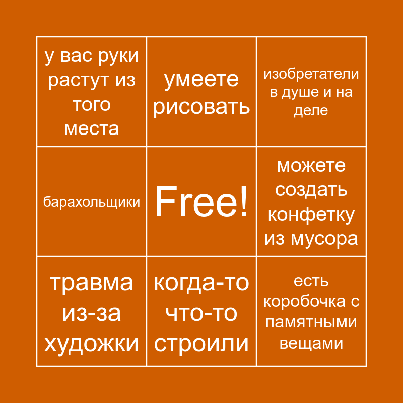 This bingo card has a free space and 8 words: можете создать конфетку из мусора, изобретатели в душе и на деле, умеете рисовать, травма из-за художки, у вас руки растут из того места, есть коробочка с памятными вещами, барахольщики and когда-то что-то строили.
