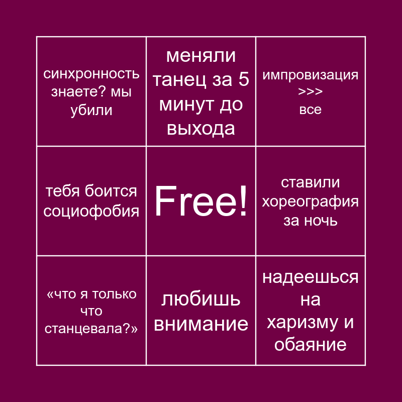 This bingo card has a free space and 8 words: ставили хореография за ночь, импровизация >>> все, меняли танец за 5 минут до выхода, «что я только что станцевала?», синхронность знаете? мы убили, надеешься на харизму и обаяние, тебя боится социофобия and любишь внимание.