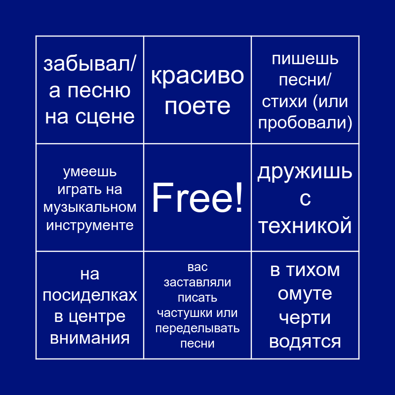 This bingo card has a free space and 8 words: дружишь с техникой, пишешь песни/стихи (или пробовали), красиво поете, на посиделках в центре внимания, забывал/а песню на сцене, в тихом омуте черти водятся, умеешь играть на музыкальном инструменте and вас заставляли писать частушки или переделывать песни.