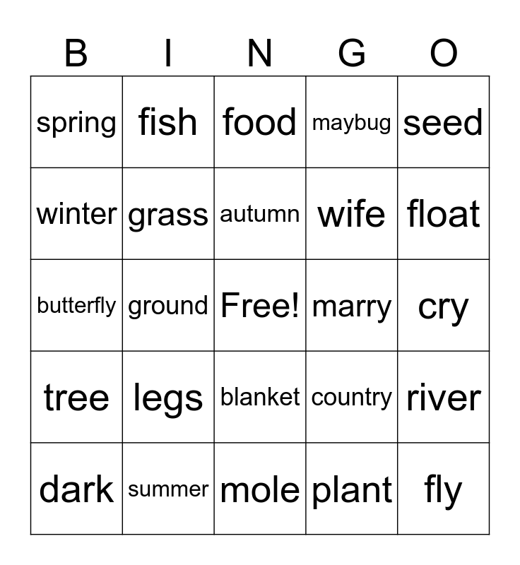 This bingo card has a free space and 29 words: dark, sky, ground, son, spring, food, grass, legs, marry, summer, cry, fly, mole, plant, float, dead, blanket, tree, seed, butterfly, country, rich, wife, winter, maybug, fish, river, autumn and bird.