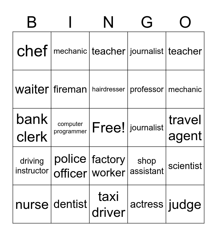 This bingo card has a free space and 24 words: police officer, dentist, hairdresser, nurse, teacher, chef, waiter, mechanic, journalist, factory worker, professor, bank clerk, shop assistant, scientist, fireman, actress, travel agent, teacher, mechanic, computer programmer, judge, driving instructor, journalist and taxi driver.