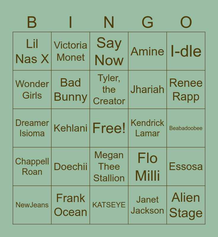 This bingo card has a free space and 24 words: Doechii, Frank Ocean, Tyler, the Creator, NewJeans, I-dle, Lil Nas X, Wonder Girls, Victoria Monet, Kendrick Lamar, Megan Thee Stallion, Jhariah, Dreamer Isioma, Flo Milli, Essosa, Bad Bunny, Janet Jackson, Beabadoobee, Say Now, Renee Rapp, Kehlani, Alien Stage, Chappell Roan, Amine and KATSEYE.