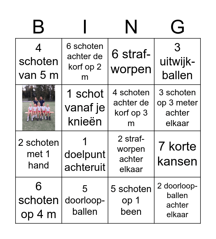 This bingo card has 1 images and 15 words: 5 doorloop-ballen, 7 korte kansen, 6 straf-worpen, 4 schoten van 5 m, 2 schoten met 1 hand, 6 schoten achter de korf op 2 m, 2 straf-worpen achter elkaar, 5 schoten op 1 been, 1 schot vanaf je knieën, 6 schoten op 4 m, 3 uitwijk-ballen, 1 doelpunt achteruit, 3 schoten op 3 meter achter elkaar, 4 schoten achter de korf op 3 m and 2 doorloop-ballen achter elkaar.