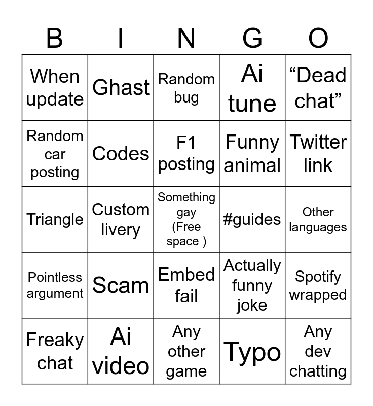 This bingo card has a free space and 24 words: Scam, Ai video, F1 posting, Freaky chat, “Dead chat”, When update, Random car posting, Ghast, #guides, Embed fail, Funny animal, Triangle, Actually funny joke, Spotify wrapped, Codes, Typo, Other languages, Random bug, Twitter link, Custom livery, Any dev chatting, Pointless argument, Ai tune and Any other game.