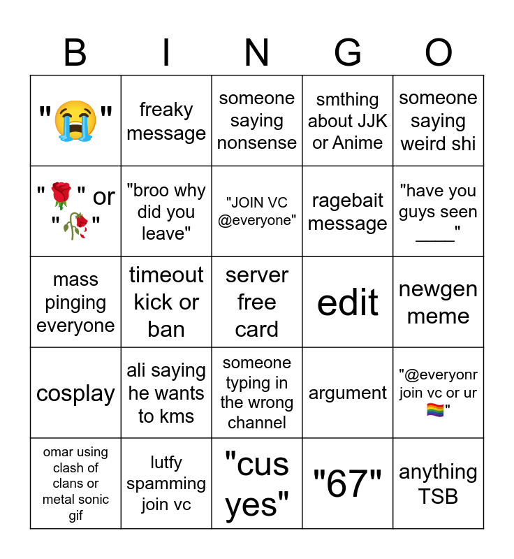 This bingo card has a free space and 24 words: ali saying he wants to kms, lutfy spamming join vc, "JOIN VC @everyone", omar using clash of clans or metal sonic gif, someone saying weird shi, "😭", "🌹" or "🥀", freaky message, edit, someone typing in the wrong channel, ragebait message, mass pinging everyone, argument, "@everyonr join vc or ur 🏳️🌈", "broo why did you leave", "67", newgen meme, someone saying nonsense, "have you guys seen ____", timeout kick or ban, anything TSB, cosplay, smthing about JJK or Anime and "cus yes".