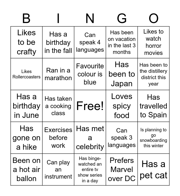 This bingo card has a free space and 29 words: Been on a hot air ballon, Took dance lessons, Has taken a cooking class, Loves to Garden, Likes to be crafty, Can speak 4 languages, Ran in a marathon, Exercises before work, Loves spicy food, Can play an instrument, Has travelled to Spain, Has a pet cat, Has binge-watched an entire tv show series in a day, Prefers Marvel over DC, Has been to the distillery district this year, Has had a pet fish, Has met a celebrity, Has gone on a hike, Likes to watch horror movies, Has a birthday in June, Can speak 3 languages, Lives in Toronto, Has been to Japan, Likes Rollercoasters, Has been on vacation in the last 3 months, Has a birthday in the fall, Is planning to go snowboarding this winter, Favourite colour is blue and Star sign is libra.
