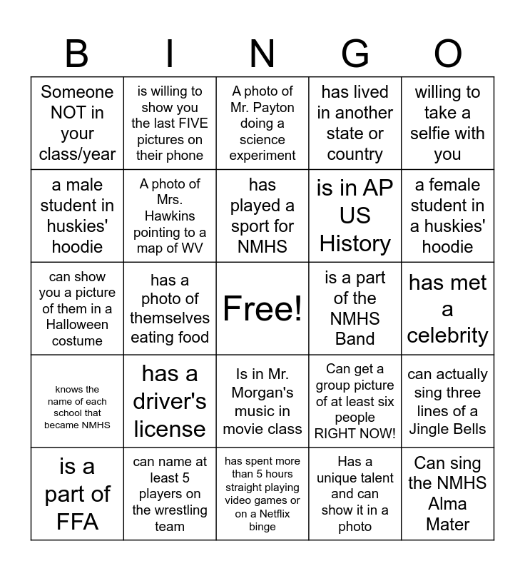 This bingo card has a free space and 24 words: has a driver's license, can name at least 5 players on the wrestling team, has played a sport for NMHS, is a part of FFA, willing to take a selfie with you, Someone NOT in your class/year, a male student in huskies' hoodie, is willing to show you the last FIVE pictures on their phone, is a part of the NMHS Band, Is in Mr. Morgan's music in movie class, is in AP US History, can show you a picture of them in a Halloween costume, Can get a group picture of at least six people RIGHT NOW!, can actually sing three lines of a Jingle Bells, A photo of Mrs. Hawkins pointing to a map of WV, Has a unique talent and can show it in a photo, has met a celebrity, A photo of Mr. Payton doing a science experiment, a female student in a huskies' hoodie, has a photo of themselves eating food, Can sing the NMHS Alma Mater, knows the name of each school that became NMHS, has lived in another state or country and has spent more than 5 hours straight playing video games or on a Netflix binge.