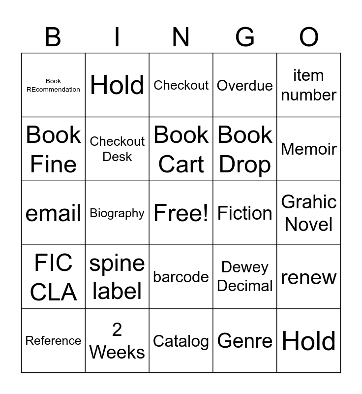 This bingo card has a free space and 31 words: Catalog, Author, Biography, Book Club, Book REcommendation, Checkout, Checkout Desk, Dewey Decimal, Fiction, Genre, Grahic Novel, Hold, Ilustrator, Manga, Memoir, Nonfiction, renew, spine label, FIC CLA, barcode, item number, call number, Reference, Hold, Book Drop, Book Fine, Overdue, email, 2 Weeks, Book Cart and Checkout Desk.