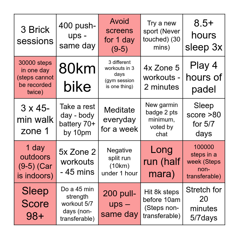 This bingo card has 25 words: 5x Zone 2 workouts - 45 mins, 200 pull-ups – same day, 3 different workouts in 3 days (gym session is one thing), Sleep Score 98+, 8.5+ hours sleep 3x, 3 Brick sessions, 30000 steps in one day (steps cannot be recorded twice), 400 push-ups - same day, New garmin badge 2 pts minimum, voted by chat, Negative split run (10km) under 1 hour, 4x Zone 5 workouts - 2 minutes, 3 x 45-min walk zone 1, Long run (half mara), 100000 steps in a week (Steps non-transferable), 80km bike, Stretch for 20 minutes 5/7days, Sleep score >80 for 5/7 days, Avoid screens for 1 day (9-5), Play 4 hours of padel, Take a rest day - body battery 70+ by 10pm, Meditate everyday for a week, Do a 45 min strength workout 5/7 days (non-transferable), 1 day outdoors (9-5) (Car is indoors), Try a new sport (Never touched) (30 mins) and Hit 8k steps before 10am (Steps non-transferable).
