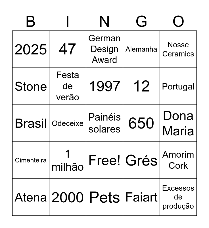 This bingo card has 26 words: Free!, Faiart, 1997, 2000, Nosse Ceramics, 2025, Stone, 47, Dona Maria, Grés, 12, Brasil, Amorim Cork, Atena, Odeceixe, Pastelaria, Alemanha, Cimenteira, German Design Award, Painéis solares, Portugal, Pets, 650, 1 milhão, Festa de verão and Excessos de produção.