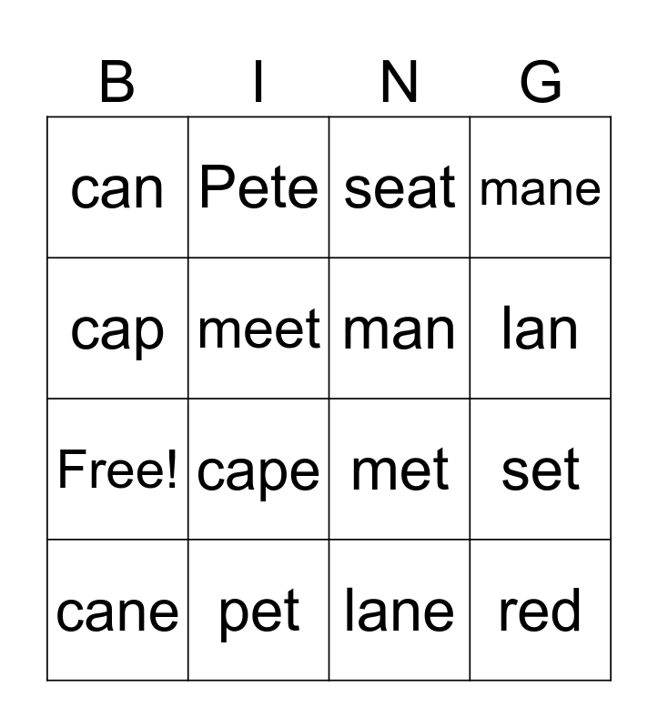 This bingo card has 16 words: pet, set, seat, can, Free!, Pete, met, lane, cap, meet, cane, mane, cape, lan, man and red.