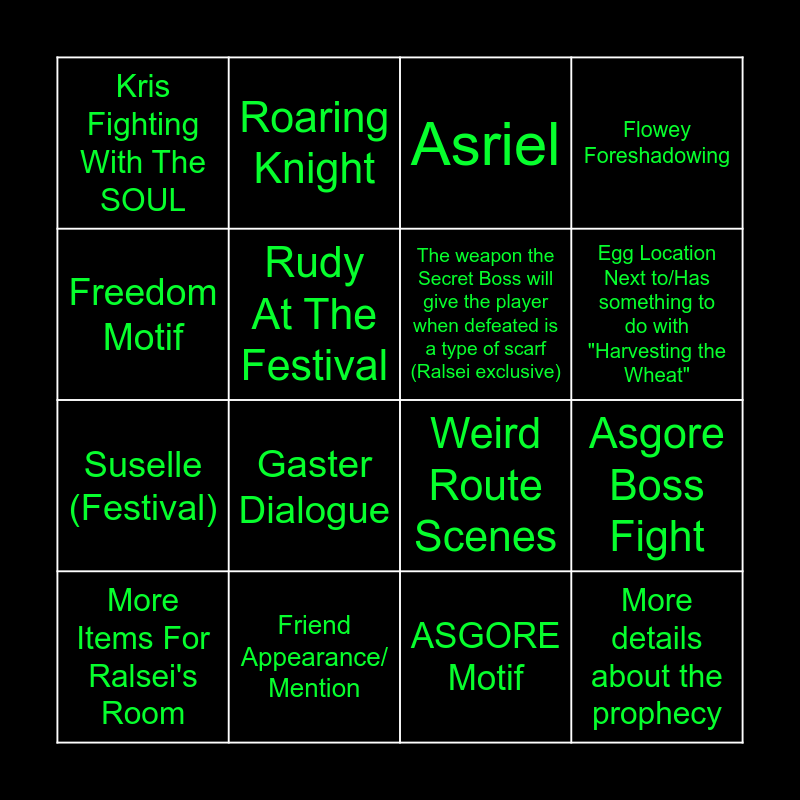 This bingo card has 16 words: Friend Appearance/ Mention, Asgore Boss Fight, Asriel, Kris Fighting With The SOUL, Suselle (Festival), Roaring Knight, Weird Route Scenes, ASGORE Motif, Freedom Motif, Rudy At The Festival, More Items For Ralsei's Room, Flowey Foreshadowing, Gaster Dialogue, Egg Location Next to/Has something to do with "Harvesting the Wheat", The weapon the Secret Boss will give the player when defeated is a type of scarf (Ralsei exclusive) and More details about the prophecy.