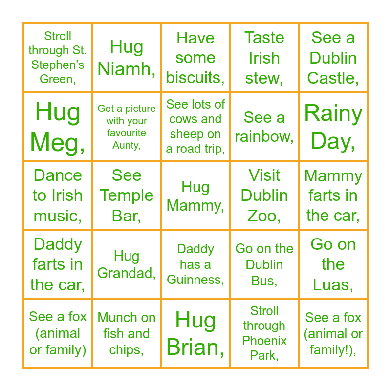This bingo card has 52 words: Free!, Hug Mammy,, Hug Daddy,, Hug Brian,, Hug Grandad,, Hug Claire,, Hug Niamh,, Hug Christine,, Hug Meg,, Hug Bradley,, Get a picture with your favourite Aunty,, Sleepover in Brian’s,, Go on the Luas,, Go on the Dublin Bus,, Go on the Train,, Take a day trip to Howth,, See lots of cows and sheep on a road trip,, Visit Dublin Zoo,, Visit St. Patrick’s Cathedral,, See a Dublin Castle,, See Temple Bar,, Stroll through Phoenix Park,, Stroll through St. Stephen’s Green,, See a rainbow,, See a double rainbow,, See a fox (animal or family!),, See a leprechaun (real or imaginary!),, Collect a postcard,, Rainy Day,, Rainy and sunny in the same day,, Taste Irish soda bread,, Taste Irish stew,, Try an Irish breakfast,, Try a cup of tea,, Have some Irish strawberries,, Have some biscuits,, Munch on fish and chips,, Eat bangers and mash,, Have some apple tart with custard,, Have an Easter egg,, Buy lots of Irish chocolate,, Mammy farts in the car,, Daddy farts in the car,, Pet Nanny’s dogs,, Daddy has a Guinness,, Take a picture with an Easter bunny,, Learn an Irish saying,, Dance to Irish music,, Go to the Lego Store,, Have a Chinese takeaway for dinner,, See a fox (animal or family) and Try some Irish strawberries..