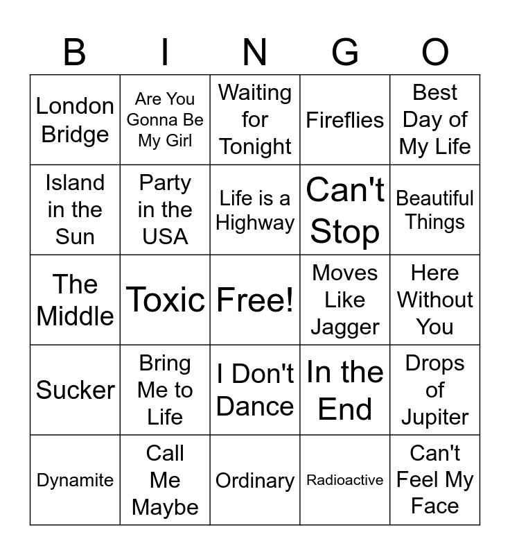 This bingo card has a free space and 29 words: Dynamite, 1, 2 Step, Toxic, Just Dance, London Bridge, Waiting for Tonight, Party in the USA, Bring Me to Life, Moves Like Jagger, Call Me Maybe, Here Without You, Can't Feel My Face, Ordinary, Radioactive, Beautiful Things, Golden, I Don't Dance, Sucker, Best Day of My Life, The Middle, In the End, Centuries, Can't Stop, Island in the Sun, Fireflies, Are You Gonna Be My Girl, Drops of Jupiter, Life is a Highway and Poker Face.