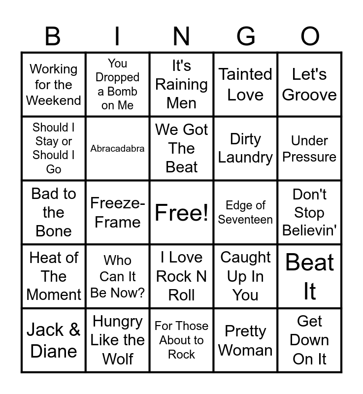 This bingo card has a free space and 39 words: Eye of the Tiger, Hurts So Good, Centerfold, Abracadabra, Jack & Diane, I Love Rock N Roll, We Got The Beat, 867-5309, Let's Groove, Heat of The Moment, Freeze-Frame, Tainted Love, Get Down On It, Don't Stop Believin', Edge of Seventeen, Who Can It Be Now?, Physical, Working for the Weekend, No One Like You, Caught Up In You, Should I Stay or Should I Go, For Those About to Rock, Dirty Laundry, Under Pressure, Mountain Music, Take Me Down, Redneck Girl, Slow Hand, Sexual Healing, You Dropped a Bomb on Me, Maneater, Apache, It's Raining Men, Hungry Like the Wolf, Pretty Woman, I Ran, Beat It, Bad to the Bone and White Wedding.