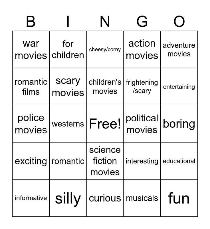 This bingo card has a free space and 35 words: documentaries, fantasy movies, animated movies, scary movies, science fiction movies, action movies, romantic films, thrillers/ suspense movies, children's movies, dramas, police movies, adventure movies, comedy movies, historical movies, war movies, political movies, musicals, westerns, exciting, fun, interesting, informative, educational, silly, cheesy/corny, entertaining, intriguing, good, frightening /scary, boring, strange, curious, romantic, for children and funny.