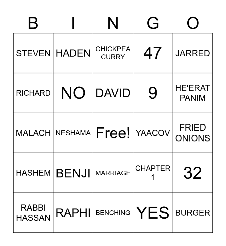 This bingo card has a free space and 24 words: BENJI, RAPHI, DAVID, RABBI HASSAN, JARRED, STEVEN, RICHARD, HADEN, YAACOV, MARRIAGE, 9, MALACH, CHAPTER 1, 32, NO, YES, FRIED ONIONS, CHICKPEA CURRY, HE'ERAT PANIM, NESHAMA, BURGER, HASHEM, 47 and BENCHING.