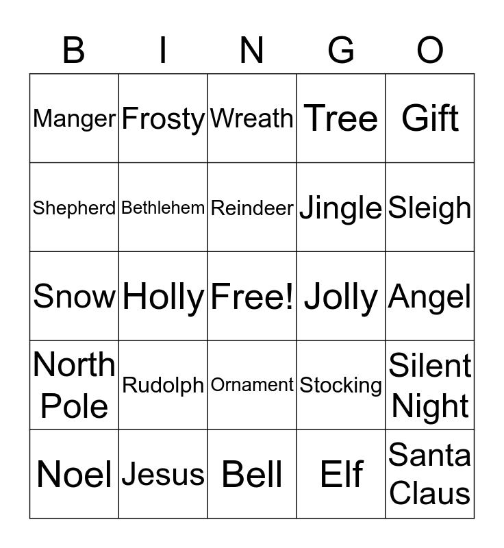 This bingo card has a free space and 24 words: Rudolph, Jesus, Reindeer, Noel, Gift, Manger, Shepherd, Frosty, Jolly, Ornament, Jingle, Snow, Stocking, Silent Night, Bethlehem, Elf, Angel, Wreath, Sleigh, Holly, Santa Claus, North Pole, Tree and Bell.