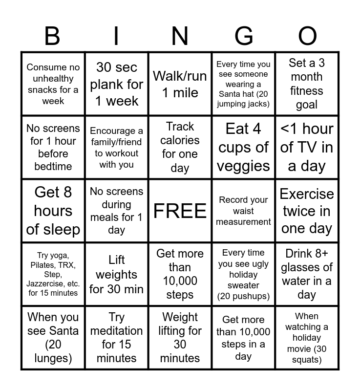 This bingo card has a free space and 24 words: Lift weights for 30 min, Try meditation for 15 minutes, Track calories for one day, When you see Santa (20 lunges), Set a 3 month fitness goal, Consume no unhealthy snacks for a week, No screens for 1 hour before bedtime, 30 sec plank for 1 week, Record your waist measurement, Get more than 10,000 steps, Eat 4 cups of veggies, Get 8 hours of sleep, Every time you see ugly holiday sweater (20 pushups), Drink 8+ glasses of water in a day, Encourage a family/friend to workout with you, Get more than 10,000 steps in a day, Exercise twice in one day, Walk/run 1 mile, <1 hour of TV in a day, No screens during meals for 1 day, When watching a holiday movie (30 squats), Try yoga, Pilates, TRX, Step, Jazzercise, etc. for 15 minutes, Every time you see someone wearing a Santa hat (20 jumping jacks) and Weight lifting for 30 minutes.