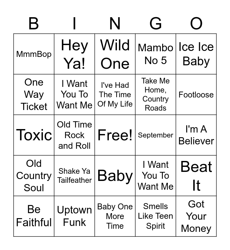 This bingo card has a free space and 24 words: Shake Ya Tailfeather, Uptown Funk, I've Had The Time Of My Life, Be Faithful, Ice Ice Baby, MmmBop, One Way Ticket, Hey Ya!, September, Baby, Take Me Home, Country Roads, Toxic, I Want You To Want Me, Beat It, I Want You To Want Me, Smells Like Teen Spirit, I'm A Believer, Wild One, Footloose, Old Time Rock and Roll, Got Your Money, Old Country Soul, Mambo No 5 and Baby One More Time.