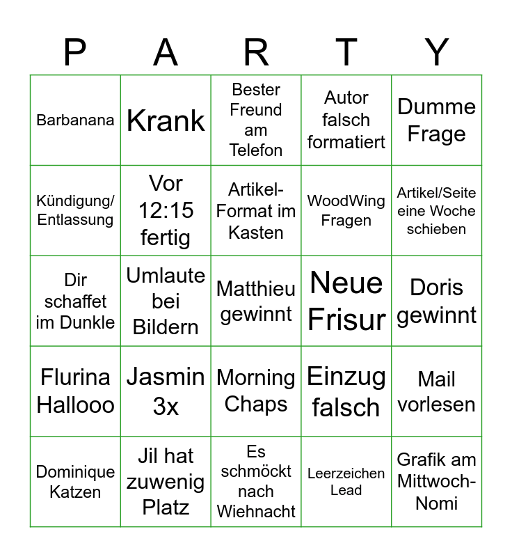 This bingo card has 30 words: Jil hat zuwenig Platz, Ortsmarke nicht formatiert, Umlaute bei Bildern, Sime schreit, Barbanana, Bester Freund am Telefon, Vor 12:15 fertig, Morning Chaps, Neue Frisur, Es schmöckt nach Wiehnacht, Doris gewinnt, Matthieu gewinnt, Leerzeichen Lead, Grafik am Mittwoch-Nomi, Artikel/Seite eine Woche schieben, Bildschirm, Einzug falsch, Flurina Hallooo, Jasmin 3x, Dumme Frage, Dir schaffet im Dunkle, Dir sit gäng no da, Krank, WoodWing Fragen, Kündigung/ Entlassung, Autor falsch formatiert, Mail vorlesen, Dominique Katzen, Artikel- Format im Kasten and Pesche erzählt.
