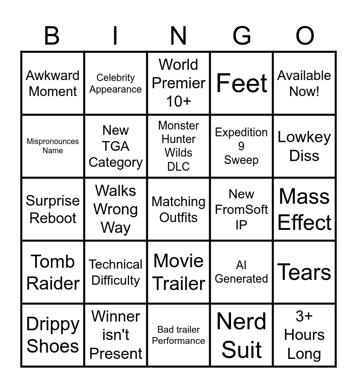 This bingo card has a free space and 24 words: Drippy Shoes, Technical Difficulty, Monster Hunter Wilds DLC, Nerd Suit, Available Now!, Awkward Moment, Celebrity Appearance, World Premier 10+, New FromSoft IP, Mass Effect, Surprise Reboot, New TGA Category, AI Generated, Tears, Mispronounces Name, Winner isn't Present, Bad trailer Performance, Feet, Lowkey Diss, Tomb Raider, Walks Wrong Way, Movie Trailer, Expedition 9 Sweep and 3+ Hours Long.