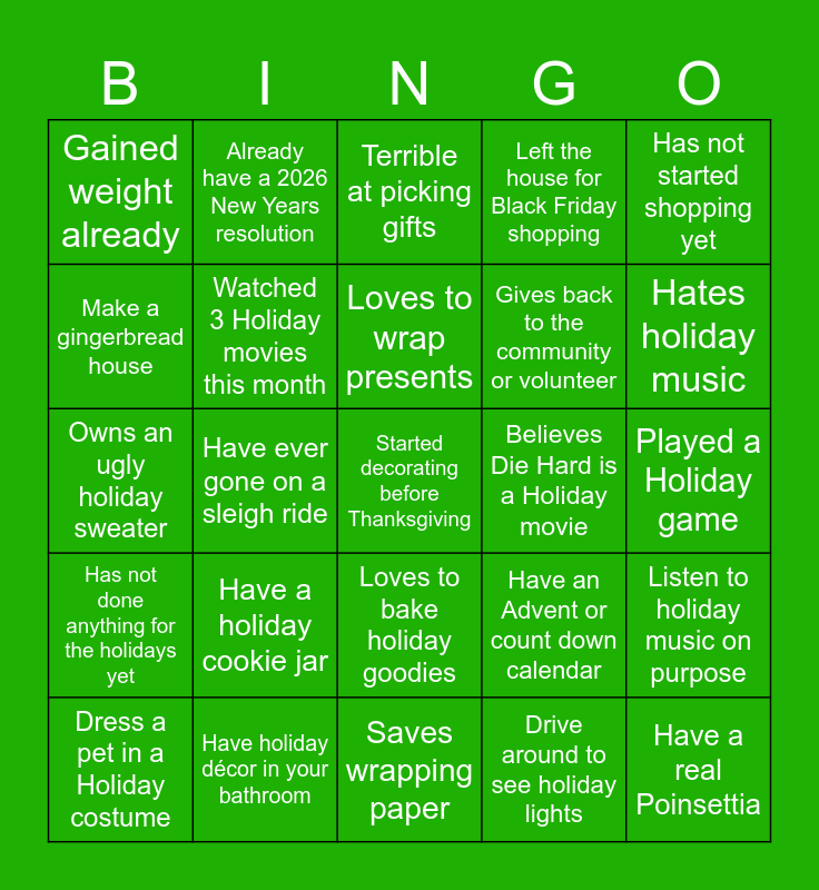 This bingo card has 35 words: Still mail physical Holiday cards, Wished someone a holiday greeting, Decorated the outside of your house, Watched 3 Holiday movies this month, Loves to bake holiday goodies, Left the house for Black Friday shopping, Make a gingerbread house, Go Caroling, Loves to wrap presents, Does Elf on a Shelf, Owns an ugly holiday sweater, Has not started shopping yet, Identifies with Scrooge, Done with your holiday shopping already, Gained weight already, Believes Die Hard is a Holiday movie, Drive around to see holiday lights, Have ever gone on a sleigh ride, Has not done anything for the holidays yet, Started decorating before Thanksgiving, Have an Advent or count down calendar, Dress a pet in a Holiday costume, Listen to holiday music on purpose, Have holiday décor in your bathroom, Terrible at picking gifts, Hates holiday music, Have a real Poinsettia, Will stay up until Midnight on NYE, Gives back to the community or volunteer, Played a Holiday game, Kissed under mistletoe, Saves wrapping paper, Have a holiday cookie jar, Already have a 2026 New Years resolution and Will travel to another country during the holiday.