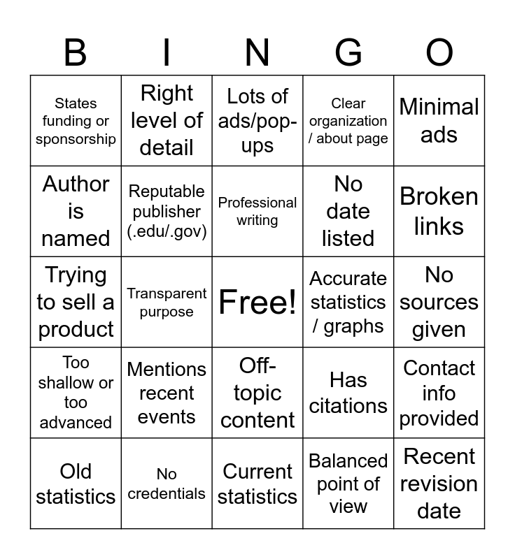 This bingo card has a free space and 48 words: Updated this year, Recent revision date, Working links, Current statistics, Mentions recent events, On-topic examples, Right level of detail, Written for your audience, Author is named, Author has relevant credentials, Reputable publisher (.edu/.gov), Clear organization / about page, Contact info provided, Has citations, Evidence supports claims, Matches other trusted sources, Professional writing, Accurate statistics / graphs, Informational tone, Minimal ads, Transparent purpose, Balanced point of view, States funding or sponsorship, No date listed, Outdated by several years, Broken links, Old statistics, References out-of-date laws/events, Off-topic content, Too shallow or too advanced, Irrelevant examples, Doesn’t answer your research question, Anonymous author, Unknown publisher, No credentials, Influencer writing outside expertise, Vague or missing “About” page, No sources given, Unverified claims, Contradicts reliable sources, Obvious typos/errors, Emotional or sensational language, Lots of ads/pop-ups, Clickbait title, Trying to sell a product, Heavy bias, Hidden agenda and Links and images still work.