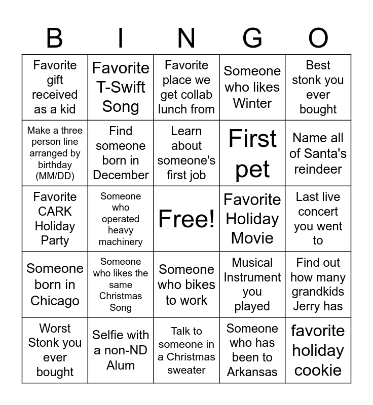 This bingo card has a free space and 24 words: Someone who likes the same Christmas Song, Selfie with a non-ND Alum, Learn about someone's first job, Worst Stonk you ever bought, Best stonk you ever bought, Favorite gift received as a kid, Make a three person line arranged by birthday (MM/DD), Favorite T-Swift Song, Favorite Holiday Movie, Someone who bikes to work, First pet, Favorite CARK Holiday Party, Musical Instrument you played, Find out how many grandkids Jerry has, Find someone born in December, Someone who has been to Arkansas, Last live concert you went to, Favorite place we get collab lunch from, Name all of Santa's reindeer, Someone who operated heavy machinery, favorite holiday cookie, Someone born in Chicago, Someone who likes Winter and Talk to someone in a Christmas sweater.