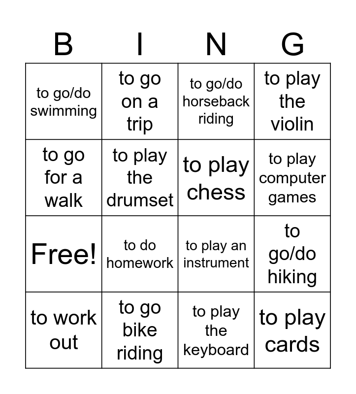 This bingo card has 20 words: to go/do hiking, To be careful/ pay attention, to go/do horseback riding, to cook/ do cooking, to work out, to go for a walk, to go bike riding, to go/do swimming, Free!, to go on a trip, to do homework, to play an instrument, to play the drumset, to play cards, to play chess, to play checkers, to play computer games, to play the violin, to play the keyboard and to play the saxophone.