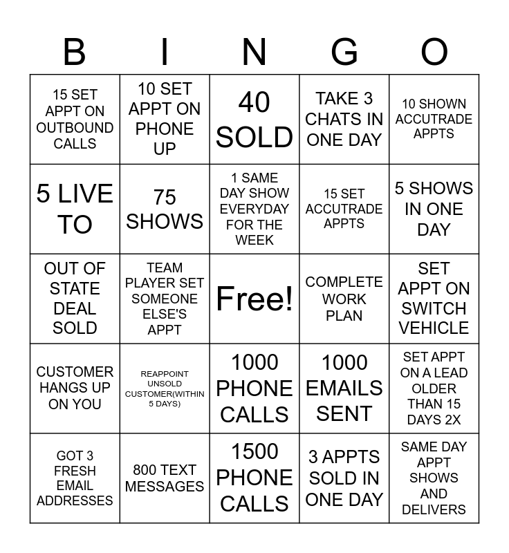 This bingo card has a free space and 24 words: REAPPOINT UNSOLD CUSTOMER(WITHIN 5 DAYS), 800 TEXT MESSAGES, 1 SAME DAY SHOW EVERYDAY FOR THE WEEK, GOT 3 FRESH EMAIL ADDRESSES, 10 SHOWN ACCUTRADE APPTS, 15 SET APPT ON OUTBOUND CALLS, 5 LIVE TO, 10 SET APPT ON PHONE UP, COMPLETE WORK PLAN, 1000 PHONE CALLS, 15 SET ACCUTRADE APPTS, OUT OF STATE DEAL SOLD, 1000 EMAILS SENT, SET APPT ON A LEAD OLDER THAN 15 DAYS 2X, 75 SHOWS, 3 APPTS SOLD IN ONE DAY, SET APPT ON SWITCH VEHICLE, 40 SOLD, 5 SHOWS IN ONE DAY, TEAM PLAYER SET SOMEONE ELSE'S APPT, SAME DAY APPT SHOWS AND DELIVERS, CUSTOMER HANGS UP ON YOU, TAKE 3 CHATS IN ONE DAY and 1500 PHONE CALLS.
