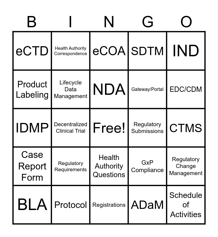 This bingo card has a free space and 25 words: Regulatory Requirements, Registrations, NDA, BLA, IND, eCTD, Product Labeling, Health Authority Correspondence, Regulatory Submissions, Health Authority Questions, Gateway/Portal, IDMP, GxP Compliance, Regulatory Change Management, Lifecycle Data Management, eTMF, CTMS, eCOA, EDC/CDM, Decentralized Clinical Trial, Schedule of Activities, Protocol, Case Report Form, SDTM and ADaM.