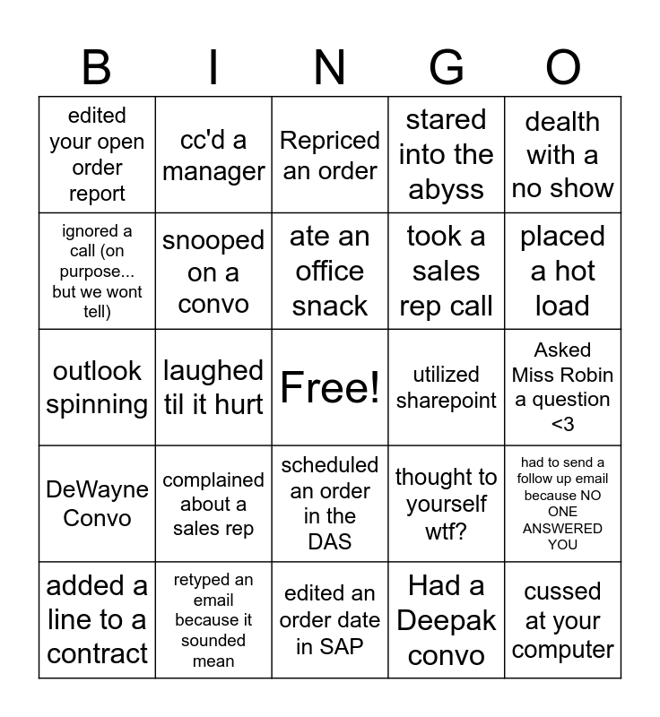 This bingo card has a free space and 24 words: complained about a sales rep, retyped an email because it sounded mean, ate an office snack, added a line to a contract, dealth with a no show, edited your open order report, ignored a call (on purpose... but we wont tell), cc'd a manager, utilized sharepoint, scheduled an order in the DAS, took a sales rep call, outlook spinning, thought to yourself wtf?, had to send a follow up email because NO ONE ANSWERED YOU, snooped on a convo, Had a Deepak convo, Asked Miss Robin a question <3, Repriced an order, placed a hot load, laughed til it hurt, cussed at your computer, DeWayne Convo, stared into the abyss and edited an order date in SAP.