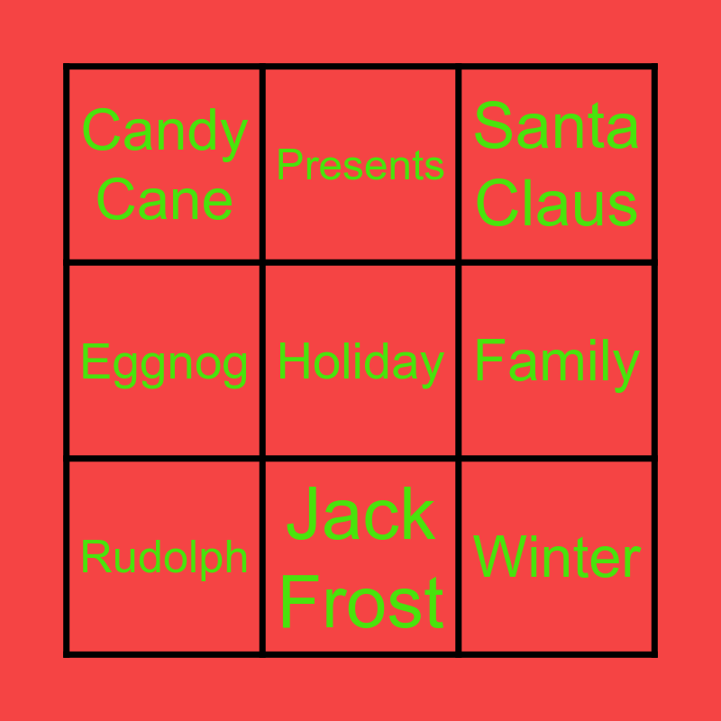 This bingo card has 9 words: Rudolph, Santa Claus, Presents, Eggnog, Candy Cane, Family, Holiday, Winter and Jack Frost.