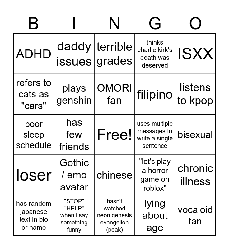 This bingo card has a free space and 24 words: Gothic / emo avatar, "STOP" "HELP" when i say something funny, OMORI fan, has random japanese text in bio or name, ISXX, ADHD, refers to cats as "cars", daddy issues, uses multiple messages to write a single sentence, chinese, filipino, poor sleep schedule, "let's play a horror game on roblox", chronic illness, plays genshin, lying about age, bisexual, terrible grades, listens to kpop, has few friends, vocaloid fan, loser, thinks charlie kirk's death was deserved and hasn't watched neon genesis evangelion (peak).